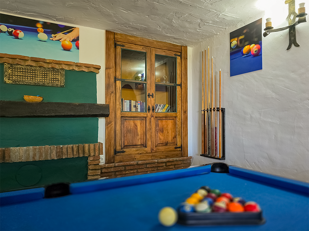 Planta Baja: La planta baja dispone de una amplia terraza cubierta rodeada de frondosa vegetación. Aquí encontrarás tres dormitorios: uno con cama doble, otro con cama doble y una cama individual, y el tercero con una cama individual. Además, esta planta cuenta con un baño independiente con ducha. También se encuentra aquí una sala de juegos equipada con una mesa de billar profesional, futbolín y diana con dardos, ofreciendo entretenimiento para toda la familia.